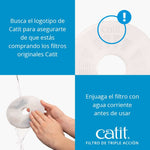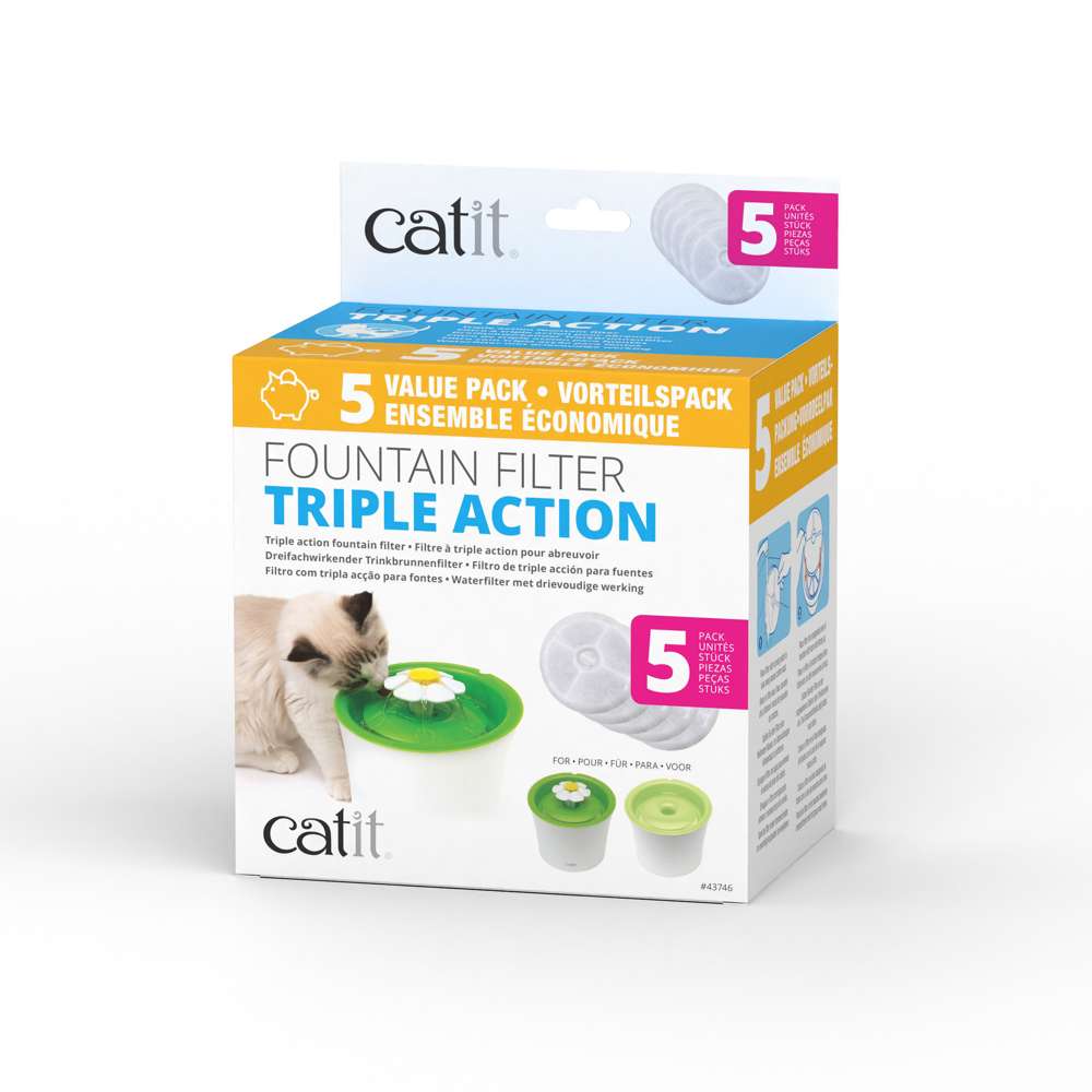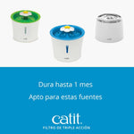 Eficaz filtro de agua de triple acción para las Catit Flower Fountain. Estos auténticos Filtros de Triple Acción para Fuentes Catit proporcionan filtración tres en uno para que tu gato pueda disfrutar de agua potable limpia y sin olores, directamente de su Catit Flower Fountain.