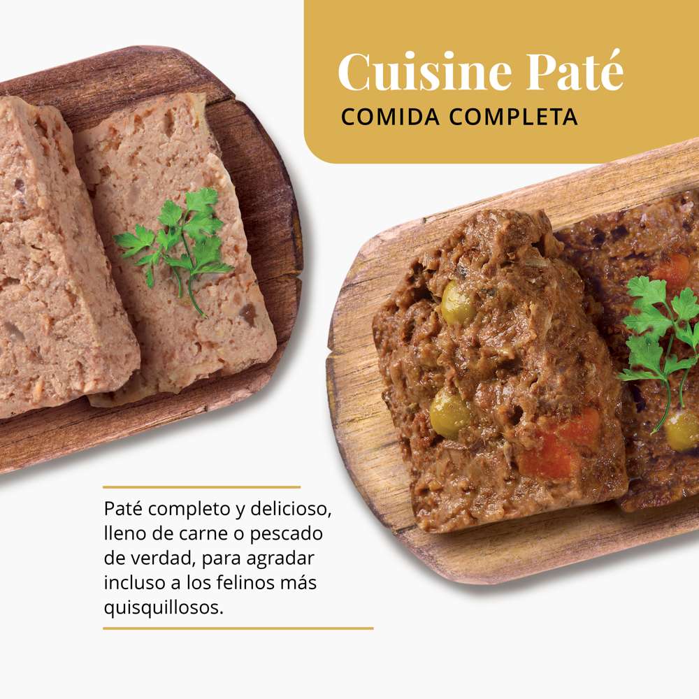 Delicioso paté para gatos completo lleno de carne y pescado de verdad
