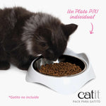 Dentro de la caja encontrarás un Plato Catit PIXI, una bolsa de 400 g de comida Catit Recipes KITTEN Receta de Aves con taza medidora, Catit Cuisine Mousse de Pollo para Gatitos y un paquete de 4 snacks cremosos Catit Creamy.