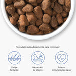- Con ácidos grasos Omega-3 para ayudar a promover una piel y un pelaje sanos.