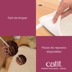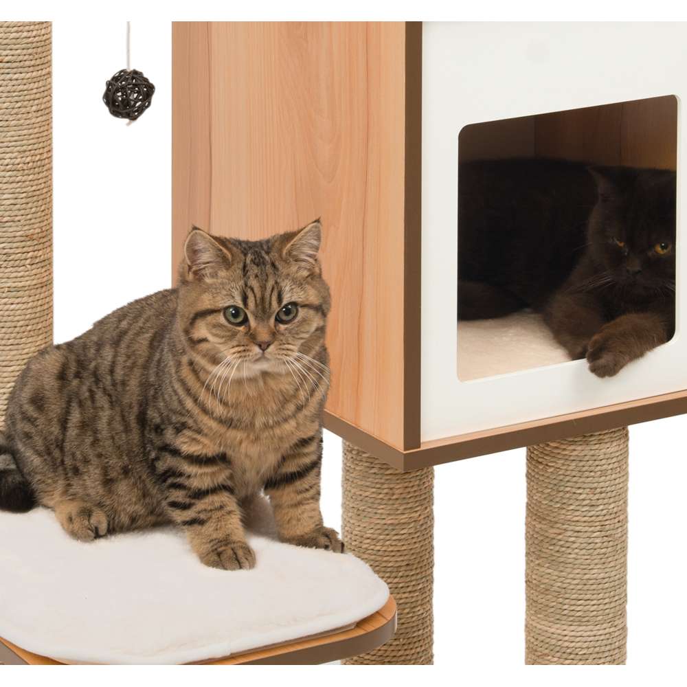 El Vesper High Base es una excelente plataforma de observación para los gatos que aman estar en las alturas. Los altos y delgados postes rascadores fomentan el rascado en una postura alargada, mientras que el refugio en forma de cubo proporciona un espacio acogedor para una siesta.