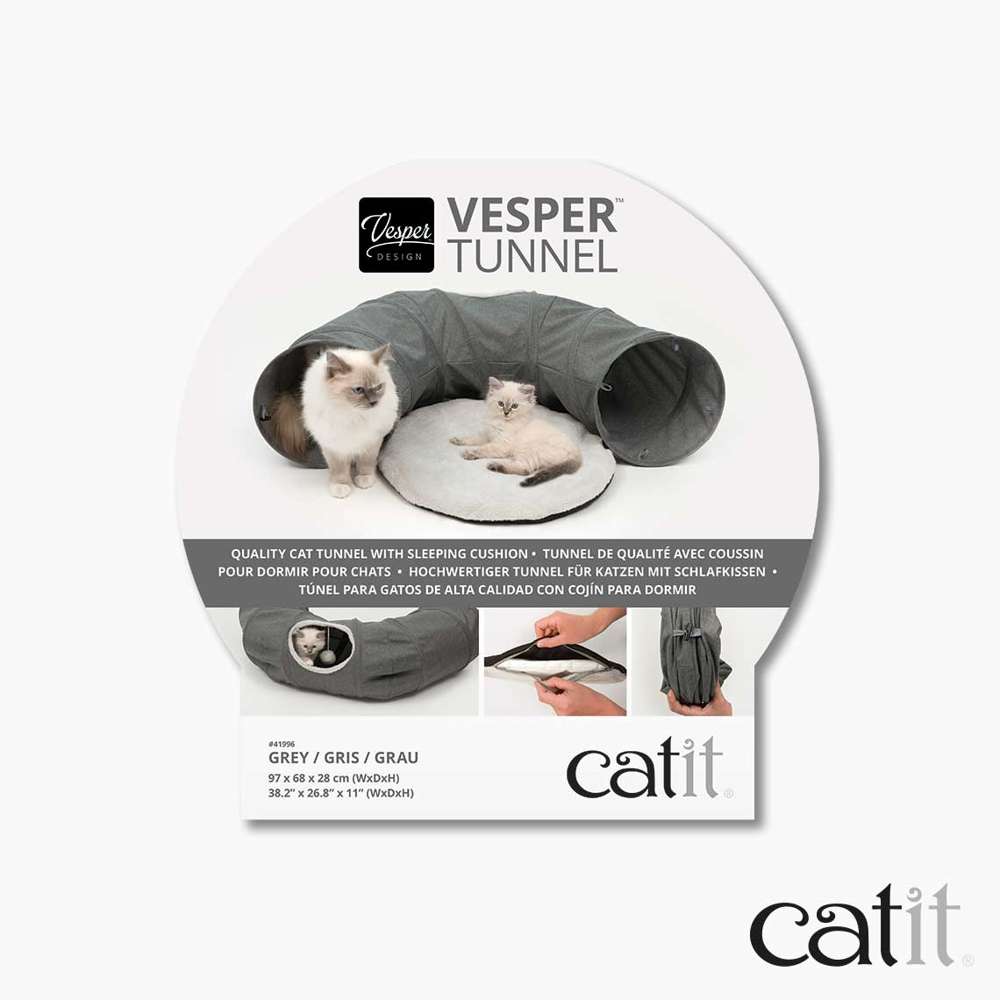 El Catit Vesper Tunnel es un túnel de juego abierto para gatos excepcionalmente elegante. Tiene una pequeña abertura en el medio con una pelota de peluche colgando de una cuerda. Este lugar es perfecto para que los gatos observen su entorno. Si tu gato necesita un tiempo de relajación después de jugar, puede relajarse en el cojín acolchado redondo.