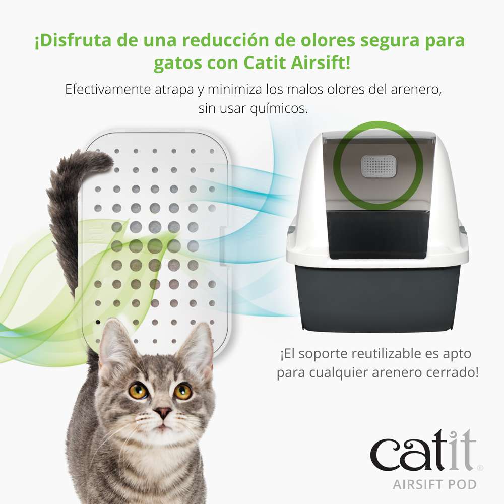- Incluye soporte de plástico reutilizable y 1 almohadilla filtrante Catit Airsift