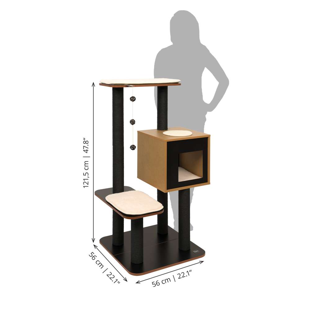 El Vesper High Base es una excelente plataforma de observación para los gatos que aman estar en las alturas. Los altos y delgados postes rascadores fomentan el rascado en una postura alargada, mientras que el refugio en forma de cubo proporciona un espacio acogedor para una siesta.