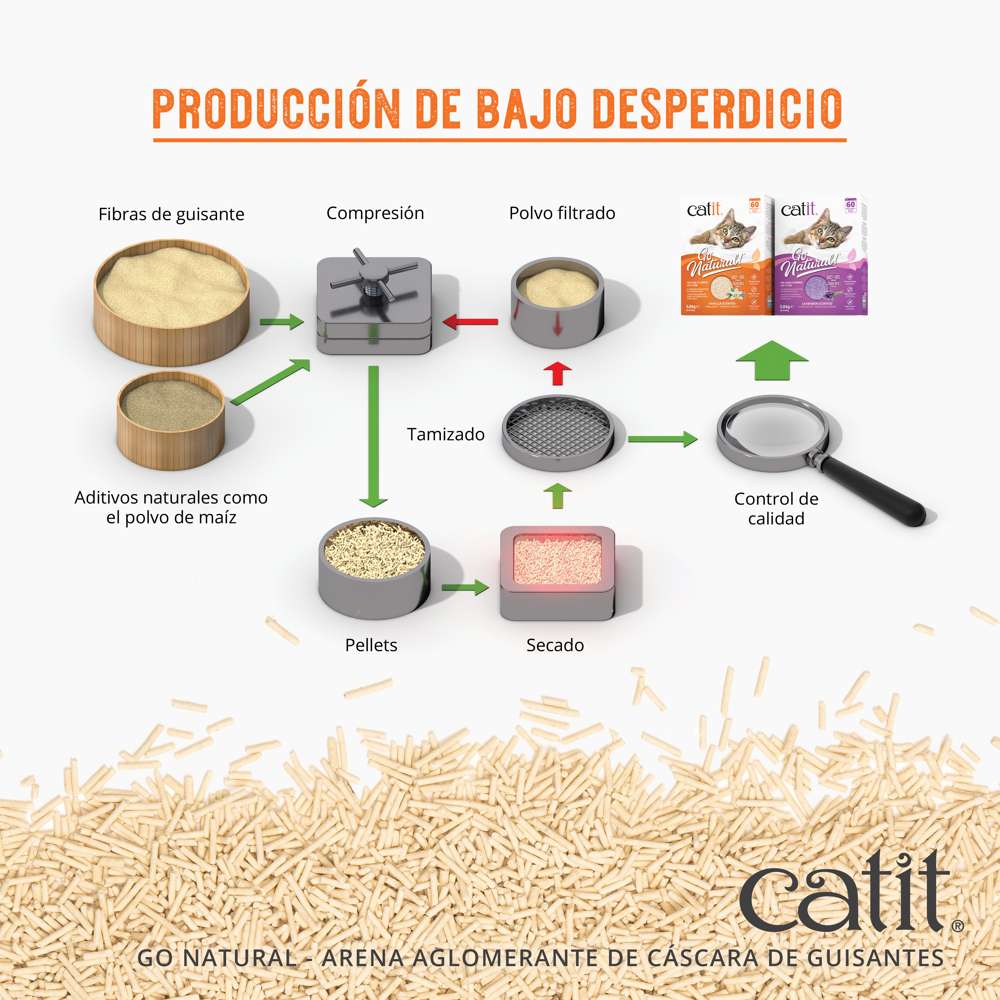 ¡La Arena Aglomerante de Cáscara de Guisante Go Natural! absorbe hasta 3 veces su peso en líquido! Reciclamos cáscaras de guisantes vacías que de otro modo irían a los vertederos y mezclamos materias primas de calidad alimentaria como almidón, polvo de maíz y goma guar como agentes aglomerantes naturales. ¡El resultado es una arena para gatos agradable a la vista y muy absorbente, que se aglomera naturalmente sin una mota de polvo!
